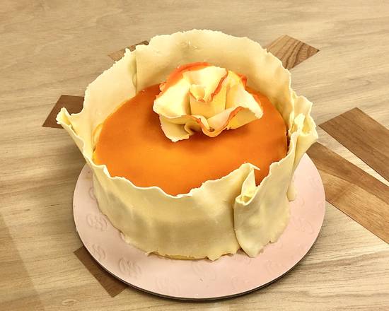 Tarta Melania: rellena de delicioso mousse de mango y terminación en salsa de mango y maracuyá. Decorada con apanalado blanco de chocolate.